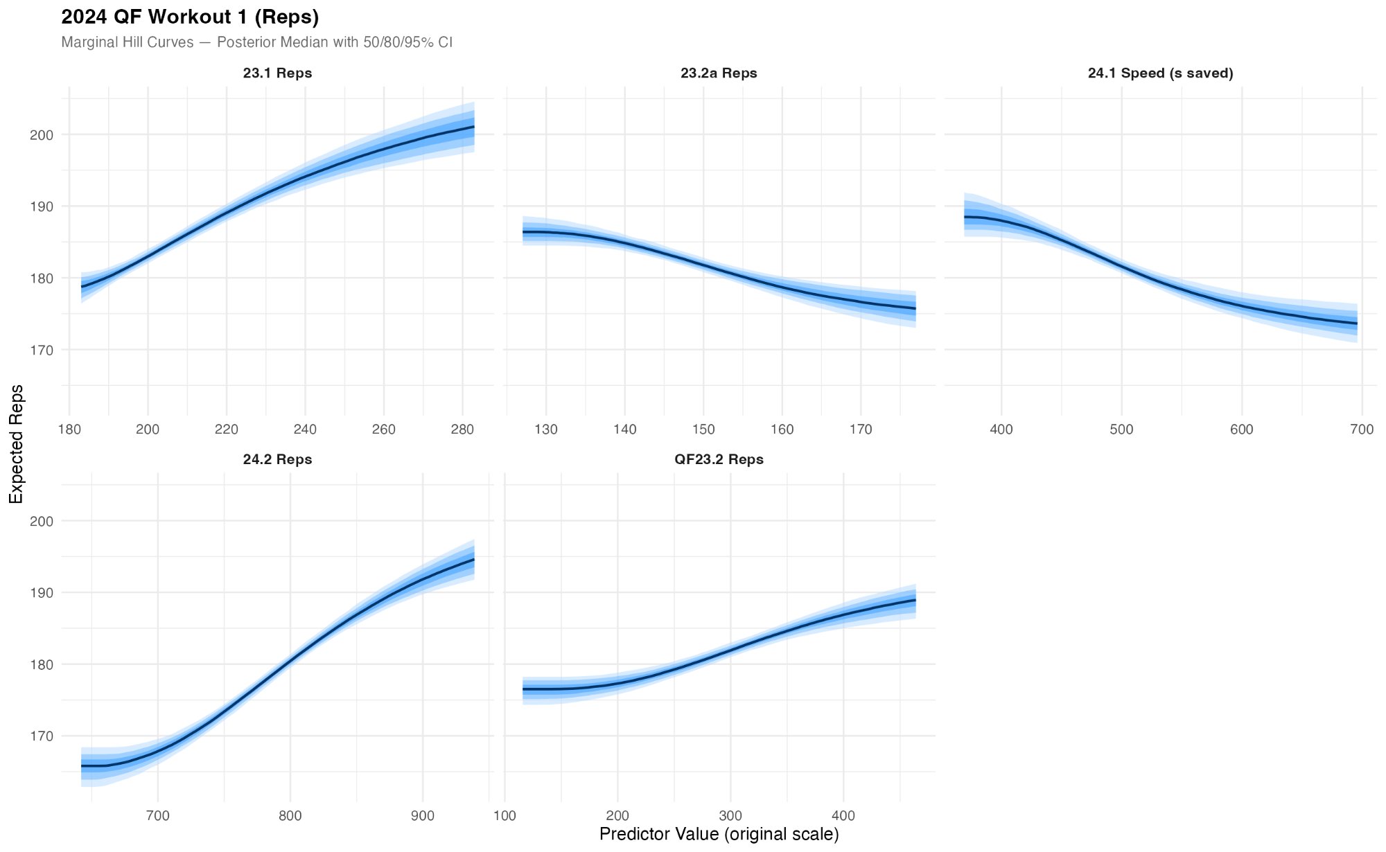 The model uses an automatic relevance detection mechanism that lets uninformative predictors shrink toward zero, so only predictors with real signal influence the outcome. Two model types handle the different scoring formats: a negative binomial model for rep-based AMRAP workouts (QF1, QF4), and a multipart model for capped workouts (QF2, QF3) that separately estimates the probability of completing the workout and the completion time conditional on finishing.