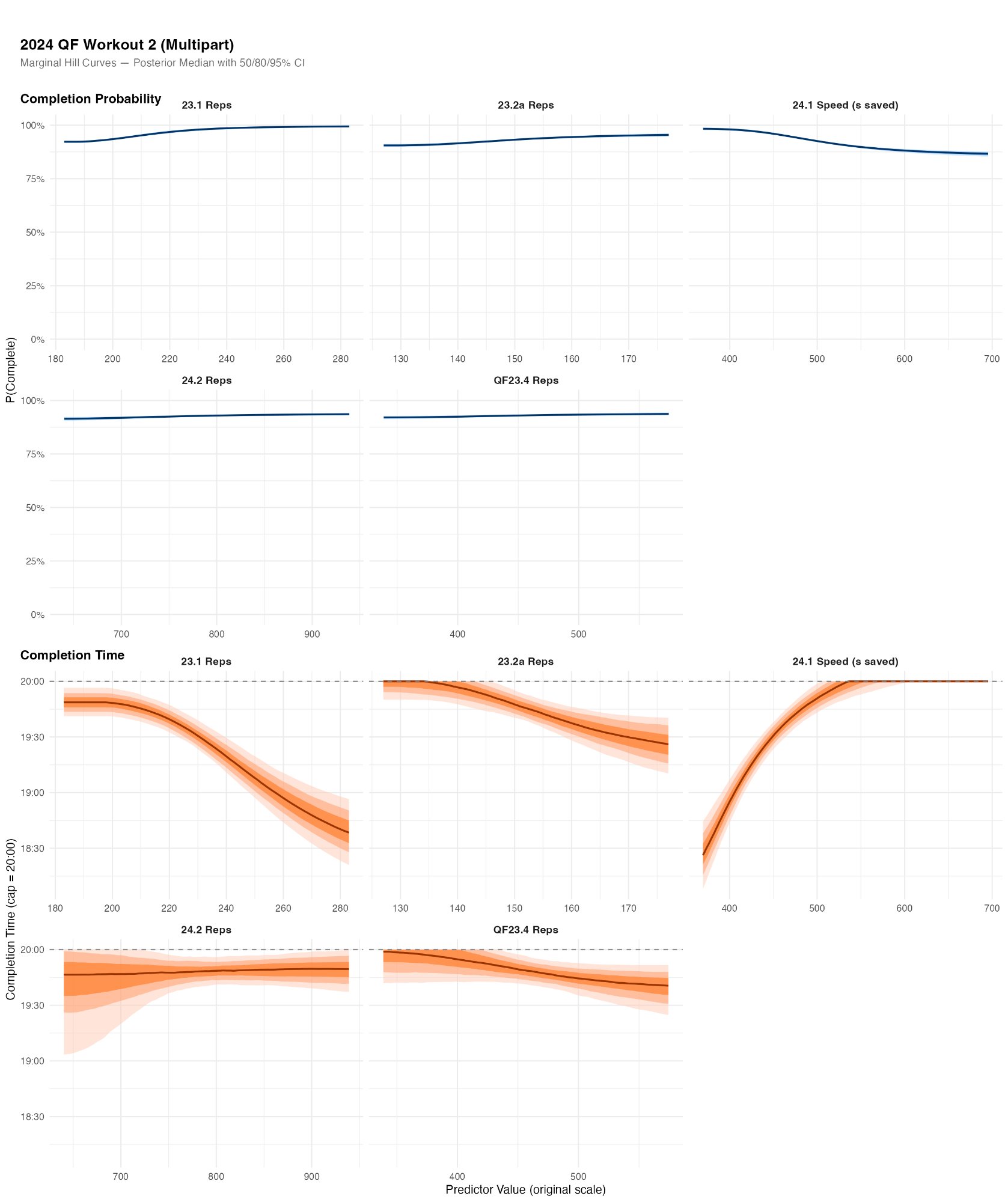 For QF2 (the pure engine test of wall balls and burpee box jump-overs), the completion probability curves are nearly flat: among returning QF competitors, almost everyone finishes. The interesting story is in the completion time model, where 23.1 Reps, 23.2a Reps, and 24.1 Speed all show clear relationships. 24.1 Speed is the strongest, which makes sense: 24.1 included 90 lateral burpees, directly transferable to the burpee box jump-overs in QF2. The aerobic markers (23.1 rowing, 23.2a) capture the sustained output required to maintain pace across 300 reps.
