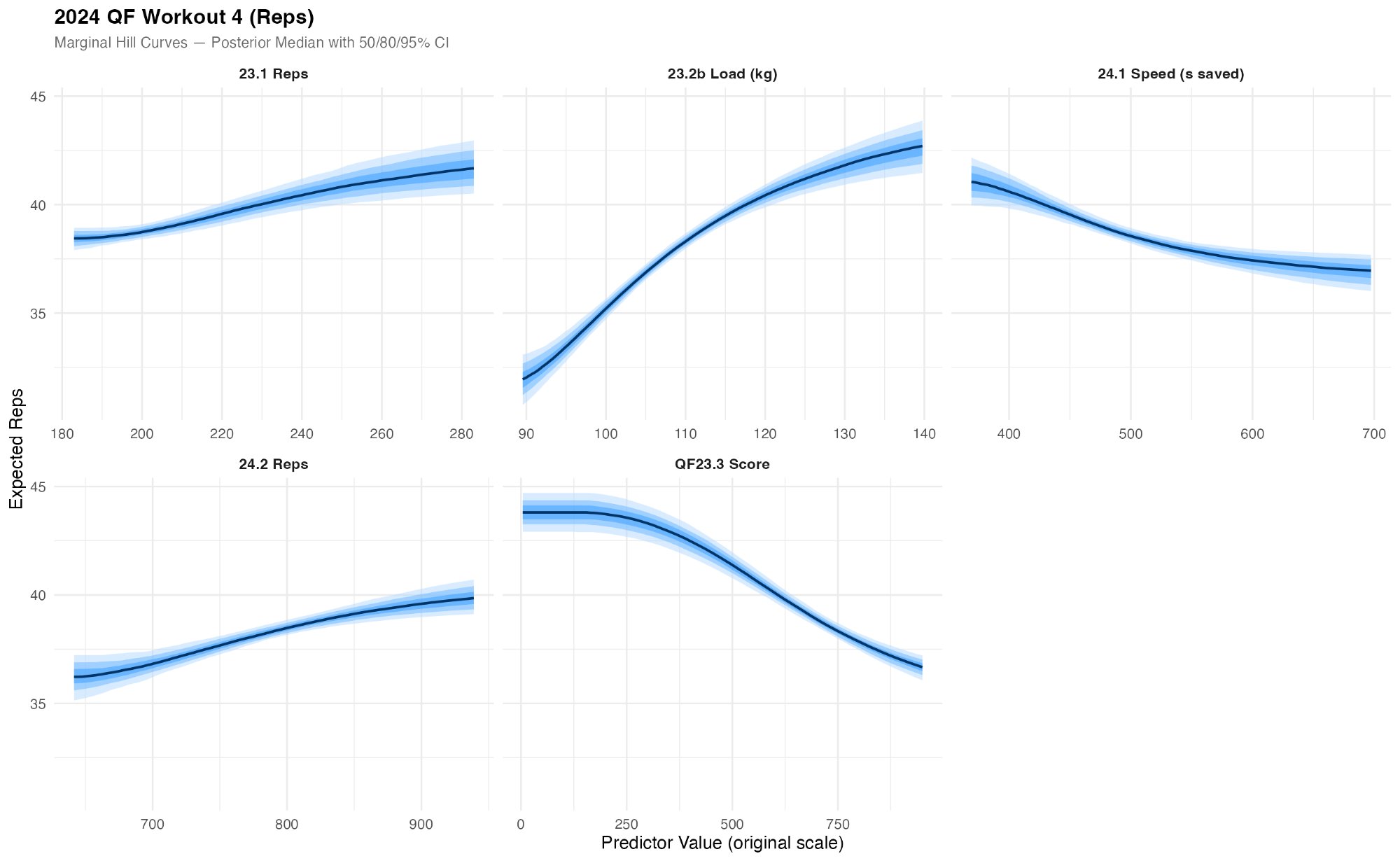 Conversely, QF4 is dominated by 23.2b Load (1RM clean) and QF23.3 Score (which included heavy clean and jerks). The 23.2b Load curve is the single clearest result in the entire analysis, showing a steep rise from roughly 33 to 42 expected reps as clean load increases from 90 to 140 kg, followed by a plateau. This is a textbook capacity gate: athletes need a minimum strength threshold to be competitive, but beyond that threshold, additional strength yields diminishing returns (a pattern that mirrors the saturation effects observed in my kayaking dose-response analysis, suggesting capacity gating is a general feature of athletic performance).